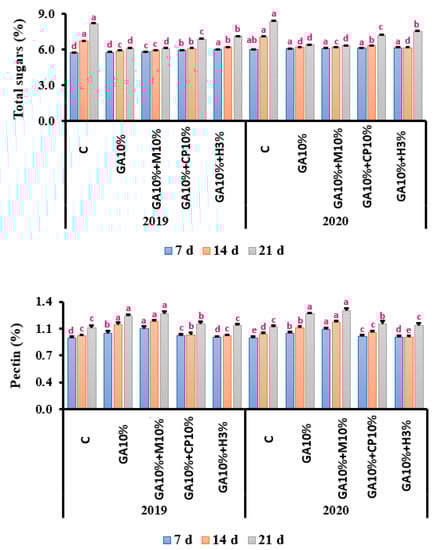 - Khaliq, G.; Mohamed, M.T.M.; Ali, A.; Ding, P.; Ghazali, H.M. Effect of gum arabic coating combined with calcium chloride on physico-chemical and qualitative properties of mango (Mangifera indica L.) fruit during low temperature storage. Sci. Hortic. 2015, 190, 187–194. [Google Scholar] [CrossRef]