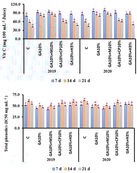 3.5. Effects on VC Juice Content, Total Phenols, and Antioxidants Activity
