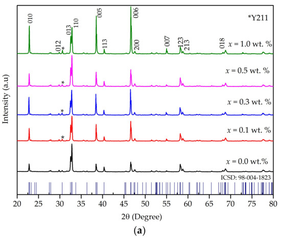 The XRD patterns of pure Y123 and Y123 added with graphene nanoparticle, where x = 0.0 wt.%, 0.1 wt.%, 0.3 wt.%, 0.5 wt.% and 1.0 wt.% samples are shown in Figure 2a. The data were analyzed by X’Pert Highscore Plus software with the Rietveld refinement and ICSD database. This figure confirms that all samples are dominant by a single phase of Y123 (ICSD No. 98-004-1823) with the Pmmm symmetry space group. The highest peak of the major phase Y123 was approximately observed at 2θ = 32.84° with (110) planes that indicate all samples were constantly in the orthorhombic phase. The presence of a few secondary phases, such as Y211 (ICSD No. 98-002-8780) observed at 2θ = 29.84°, 30.56° and 47.56° with plane orientation (hkl) of (211), (112) and (512) respectively, has increased with the addition of graphene nanoparticles. The Y211 non-superconducting phase have been detected in all samples as minor peaks that are commonly observed in the Y123 superconductors as secondary phases. Even so, graphene nanoparticle reflections were not observed in the analysis of all samples due to the small values of x = wt.% used, which cannot be detected during the characterizations [22].