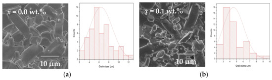 To further understand the role of graphene in the microstructure morphology of Y123 samples, an FESEM analysis was carried out. All sample images were viewed with 1000× magnification. The average grain size was calculated using Image-J software by taking around 100 selected grains from the FESEM images as listed in Table 2. From the analysis, as shown in Figure 3a–e, it was observed that the pure sample has an irregular shape distributed randomly and formed more strongly compacted with structures with less porosity. However, changes in the grain sizes were observed along with the presence of porosity with the increase of graphene nanoparticles. The average grain size obtained for samples x = 0.0 wt.%, 0.1 wt.%, 0.3 wt.%, 0.5 wt.% and 1.0 wt.% were 6.38, 4.54, 5.52, 4.75 and 8.92 µm, respectively. The average grain size of pure Y123 sample decreased from 6.38 µm to 4.75 for sample x = 0.5 wt.%. However, at x = 1.0 wt.%, the average grain size showed an increase of up to 8.92 µm with closely packed grain formation and decreased porosity between the grains. The addition of graphene nanoparticles increased the grain size with closely packed formation, promoting grain growth and contributing to the intergranular transport currents [44]. Regardless, sample x = 0.5 wt.% showed a slight porosity caused by the loosely packed formation between superconducting grains resulting in low grain connectivity. The reduction in the grain connectivity disrupted the grain growth, weakened the flux pinning and limited the Jc values.