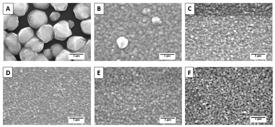 Figure 1B–F shows the morphology of GaN films deposited with various buffer layers thickness. According to the SEM results, GaN film morphologies depend significantly on the thickness of the buffer layer. As the GaN film was grown with a buffer layer, either GaN or AlN (samples B to F), almost homogeneous grains (~0.05 μm in size) are formed, demonstrating lateral growth occurs. These findings suggest that the buffer layer effectively reduces the interfacial energy between the substrate and the GaN film, allowing for a faster coalition process between islands, as evidenced by the smaller grain size formed.