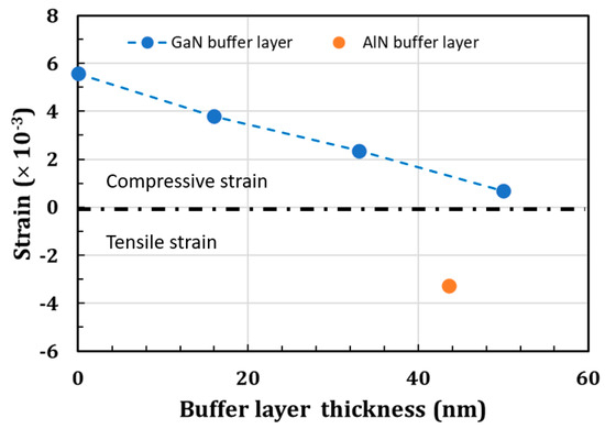 The relation between the strain and the thickness of the buffer layer is shown in Figure 4. The GaN film deposited on Si(111) substrate with or without a GaN buffer layer showed the compressive strain, while GaN grown with the AlN buffer layer showed a tensile strain. Increasing the thickness of the GaN buffer layer can reduce the strain between the Si substrate and the GaN film until it reaches film relaxation. The strain reduction is associated with the surface diffusion barrier. When the film is in tensile conditions, the surface diffusion barrier increases, while when the film is in a compressive condition, the surface diffusion barrier strain decreases [29]. The dependence of strain on the thickness of the buffer layer in our standard PA-MOCVD growth employing Si(111) as a substrate follows a pattern similar to that using the sapphire substrate to grow c-axis oriented GaN films. The difference is in the thickness of the buffer layer, which results in a relaxed GaN layer with optimum films morphology and crystal structure. The thickness of the buffer layer is higher on a sapphire substrate than on a Si(111) substrate due to a more significant lattice mismatch between c-axis GaN on sapphire and a-axis GaN on Si.