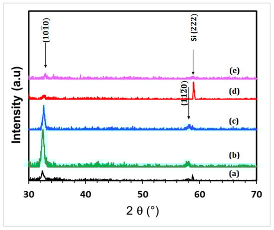 The crystal orientation of GaN films grown with the AlN buffer layer thickness of 29 nm and 44 nm is similar to that of the GaN films grown without the buffer layer, except there is an additional crystal orientation (Figure 2b). GaN films using the AlN buffer layer have more crystal orientations than the GaN films grown with the GaN buffer layer, suggesting more grain boundaries associated with the number of crystal defects in the film. Therefore, the growth of GaN films with the GaN buffer layer is preferable because the resulting GaN films have preferred crystal structure oriented in the a-axis due to the lattice mismatch between Si and GaN in the a-axis is smaller than that of Si and AlN.