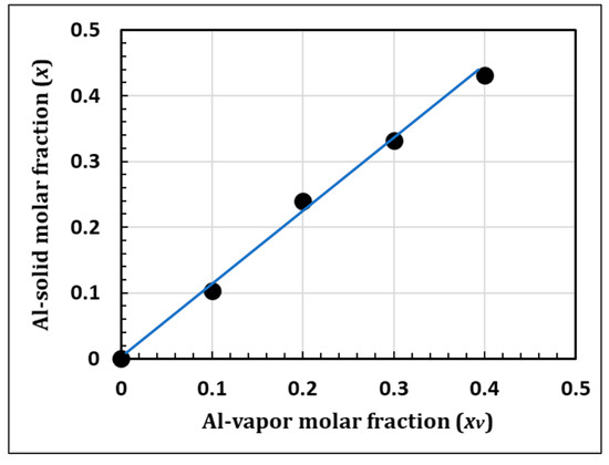 The dependence of the molar fraction of Al in the solid phase on the molar fraction of Al in the vapor phase (xv-Al) of AlGaN, grown at 700 °C with a V/III ratio of 650.