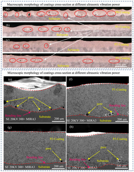 3.1. Effect of Ultrasonic Vibration on Morphology of Coating’s Cross-Section