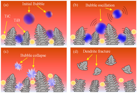 - Gao, J.; Li, C.; Chen, Z.; Han, X. Effect of ultrasonic vibration on the solidification behavior of laser cladding polycrystalline based on phase field method. Mater. Rep. 2021, 35, 12161–12168. [Google Scholar] [CrossRef]