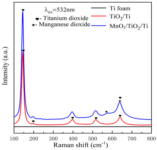 Raman spectroscopy was performed on the metal porous Ti and the prepared TiO2/Ti and MnO2/TiO2/Ti nanocomposite samples. The Raman peaks shown in the Ti and TiO2/Ti curves of Figure 2 were found at 144 cm−1, 196 cm−1, 394 cm−1, 515 cm−1, 519 cm−1, and 636 cm−1 and confirmed that the surface-modified TiO2/Ti nanocomposite conformed to the crystal form of anatase [32], consistent with the diffraction results of the X-ray analysis in Figure 1. In addition to the Raman peaks of the anatase phase of TiO2, the Raman peak of MnO2 can be observed at 575 cm−1, which can be seen in the MnO2/TiO2/Ti curve. At 575 cm−1, the peak strength of the MnO2/TiO2/Ti curve was significantly increased compared with the 636 cm−1 Raman peak of the TiO2/Ti curve, which may contain both MnO2 and TiO2. This suggested that the substance in the MnO2/TiO2/Ti nanocomposite sample prepared by alternating immersion deposition was MnO2 particles.