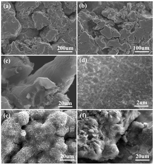 The microstructures of the metallic porous Ti, surface-modified TiO2/Ti, and MnO2/TiO2/Ti nanocomposites were elucidated by scanning electron microscopy. The results are shown in Figure 3. It can be clearly seen that the internal structure of the metal titanium foam was porous, its surface was uneven (Figure 3a), and there were micropores with irregular shapes and different sizes (Figure 3b). The microstructure of the TiO2/Ti prepared by the alkaline hydrothermal method is shown in Figure 3c,d. Here, H2Ti3O7 was annealed, and local chemical reactions and dehydration processes occurred to generate an anatase-type TiO2 [34]. The surface of the TiO2/Ti electrode material was more flattened than the surface of the foam titanium, and small TiO2 nanocrystals formed, which clustered to form a 3D nanowires network (Figure 3d), providing spaces for the subsequent loading of the MnO2 nano-coating. Moreover, the surface structure of the TiO2 was conducive to the transfer of ions in the redox Faraday reaction [35]. Often, different synthesis methods affect the forming structure of the material, and the growth mechanism of the crystals in the solution is actually quite complex and therefore not fully explained. With regard to the hydrothermal process, classical nucleation, orientation aggregation, and Ostwald ripening have been proposed [36,37]. Here, KMnO4 and MnSO4 were uniformly deposited on the TiO2/Ti formed by a co-proportionation reaction. With Ostwald maturation, MnO2 would be converted into small nanoparticles [38], and Figure 3e,f is consistent with the findings above. The uniformity of the ultra-thin manganese dioxide overlaid on the porous nanoelectrode enables the rapid transport of electrolyte ions and provides a continuous path for charge transfer [39]. The surface of the coating was uniform and compact, with a high load capacity. In summary, a nano-coating structure based on porous Ti provides good surface energy, which is conducive to the higher circulation performance of the electrode material.