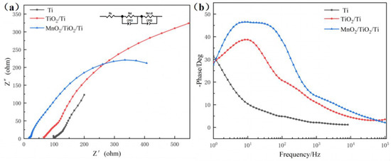 To better understand the electrochemical properties of the electrode material, an electrochemical impedance analysis was performed. EIS measurements were made in the frequency range of 1 Hz–100 kHz, and the resulting Ti, TiO2/Ti, and MnO2/TiO2/Ti Nyquist curves and Bode plots are shown in Figure 5. The Nyquist diagram (Figure 5a) consisted of a low-frequency slash and a semicircular arc phase of a medium and high frequency, the semicircular arc of the high frequency region represented the charge transfer resistance, and the Z′ and Z″ at the interface of the electrolyte and electrode were the real and imaginary parts of the impedance, respectively. The results obtained by the Bode plots (Figure 5b) were consistent with the Nyquist diagram. The equivalent circuit diagram is shown in Figure 5 [41], where Rs is the solution resistance, Rct is the interfacial charge transfer resistor, where the size of the Rct depends on the electrode area that the electrolyte can access and the conductivity of the electrode, the smaller the Rct indicates the faster the electron transfer and ion diffusion, and CPE is the constant phase angle. The capacitance values for Ti, TiO2/Ti, and MnO2/TiO2/Ti were 1.556 F, 1.315 F, and 1.573 F, respectively, and the results showed that the capacitance values of MnO2/TiO2/Ti were significantly higher than those of both of the former. As can be seen from Table 2 and Figure 5, the Rs values (15.34 Ωcm2) of the MnO2/TiO2/Ti electrodes were smaller than those of surface-modified TiO2/Ti (64.99 Ωcm2) and Ti (98.02 Ωcm2) nanocomposites, while the charge transfer resistance (4.20 Ωcm2) of the MnO2/RGO electrodes was also much smaller than that of TiO2/Ti (37.94 Ωcm2) and porous Ti (92.11 Ωcm2). In the low-frequency range, the electrode reaction kinetics were mainly controlled by diffusion (Warburg) [42], and the slope of the Nyquist plot curve of the electrode was increasing, indicating rapid ion diffusion and good capacitor performance [43,44,45].