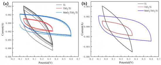 The electrochemical properties of the electrode material were further studied by performing CV tests. Figure 6 shows the test results of commercialized metal foam Ti, surface-modified TiO2/Ti, and MnO2/TiO2/Ti nanocomposites in a KOH solution with an electrolyte system of 0.5 mol/L. The scanning potential was from −0.2 to 0.7 V, and the scanning speed was 10 mV/s. As shown in Figure 6a, all the CV curves in the voltage range had a symmetrical shape. Each of the three samples were analyzed by taking ten turns. Figure 6b presents the graph of the test results for one cycle of each sample, which showed that the MnO2/TiO2/Ti curve was shaped relative to a rectangle with a small redox peak with TiO2/Ti (Faraday reaction) [13], indicating the pseudo-capacitance behavior of the electrode. Compared with the TiO2/Ti nanocomposite, the MnO2/TiO2/Ti electrode exhibited a larger CV integration area, indicating that the MnO2/TiO2/Ti nanocomposites had a higher area capacitance, showing their superior electrochemical properties and the high capacitance behavior of MnO2.