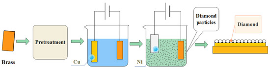 The experiment was divided into two stages, shown in Figure 1. In the first stage, the Cu interlayer was electrodeposited on the brass substrate for 3 min in an electrolyte containing 250 g/L CuSO4·5H2O and 0.5 M H2SO4 by applying a current density of 5 A/dm2, as described in our previous works [25,26]. A 200 mL beaker was used as the coating bath. The stirrer was rotated at 100 rpm and the temperature of the solution was kept at 25 °C. The pH value was approximately 0.6. A copper plate of 80 mm × 15 mm × 0.8 mm was used as the anode. Brass sheets of 50 mm × 15 mm × 0.8 mm were used as the cathode, which was sequentially ground by #400, #600, and #800 sandpapers in water, rinsed in deionized water and ultrasonically cleaned in 95 vol% alcohol solution for 5 min. After being dried in air, they were pasted with electroplated insulating tape (Tape Type: NITTO No. 360) to leave an exposed 15 mm × 15 mm area for the deposition. The distance between the anode and the cathode was 50 mm. Afterward, the sample was flushed with deionized water to remove the electrolyte and temporarily attached materials on the surface. In the second stage, nickel and diamond were compositely electrodeposited on the plated copper [27] in an electrolyte containing 280 g/L NiSO4·6H2O, 5 g/L NiCl2·6H2O, 40 g/L H3BO3 and 5 g/L Saccharin [28,29,30,31,32] with a different current density of 0.67 A/dm2, 1.33A/dm2, 2A/dm2 and 4A/dm2, respectively, as described by Wang [25]. A nickel plate of 50 mm × 25 mm × 0.8 mm was used as the anode and the immersion area was 35 mm × 25 mm. Diamond particles of 2–4 μm were evenly distributed in a porous filter cup (inner diameter: 30 mm, outer diameter: 35 mm, height: 120 mm, aperture: 1 μm; made by Toyo Roshi Kalsha in Japan) with 480 rpm stirring speed, and the concentration was 10 g/L. The brass sample coated with Cu interlayer in the last step was used as the cathode. The overall thickness of the coatings was approximately 8 µm. There were no diamond particles in the solution for the electrodeposited Ni coating, and with diamond particles for the electrodeposited Ni–diamond solution.
