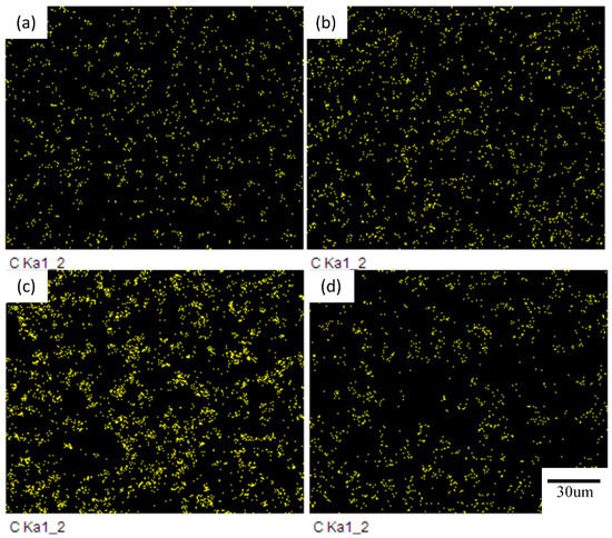 Figure 2 shows the surface morphology of the Ni coating and the Ni–diamond coating when the current density was 1.33 A/dm2. Figure 2a shows the surface morphology of the Ni coating, and Figure 2b is a magnified view of Figure 2a. Figure 2c shows the surface morphology of the Ni–diamond coating, and Figure 2d is the magnified view of Figure 2c, with a more uniform and higher content of diamond particles. It can be seen that the diamond particles were tightly surrounded by the nickel matrix and were well bound. Figure 3 shows the distribution of carbon elements of the Ni–diamond coating by EDX at different current densities. It was found that with an increase in current density, the diamond particles in the coating increased and then decreased. When the current density was 1.33 A/dm2, the content of diamond particles was the highest, and the distribution was the most uniform, the same as the reference [25].