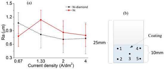 Figure 5a shows the surface roughness of the Ni coating and the Ni–diamond coating. It was found that the roughness of the Ni–diamond coating was greater than that of the Ni coating at the current density of 0.67 A/dm2, but when the current density was 1.33 A/dm2 and 2 A/dm2, the roughness of the Ni–diamond coating was less than that of the Ni coating, which may be due to the diamond particles filling the unevenness of the Ni coating. Therefore, the evenness of the Ni coating could be improved at the suitable current density due to the decreased surface roughness [20] and uniform morphology shown in Figure 3. Figure 5b shows the roughness measurement positions, where 3 point was in the center, and others were 2 mm from the edge. The roughness value is the average of five positions.