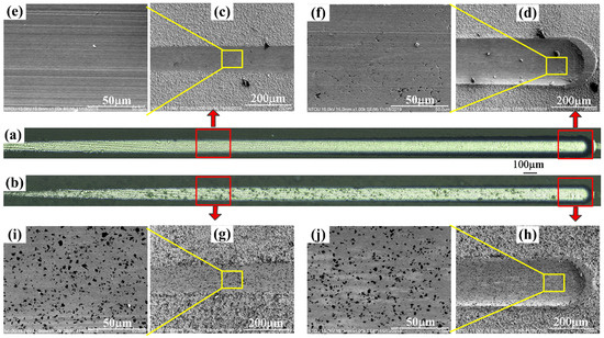 The scratch tracks of the Ni–diamond coating and the Ni coating. (a,b) are scratch tracks of the Ni coating and the Ni–diamond coating, respectively. (c,d) are scratch tracks of Ni coating at the one-third position and end position, respectively. (e,f) are magnified scratch tracks of (c,d). (g,h) are scratch tracks of the Ni–diamond coating at the one-third position and end position, respectively. (i,j) are magnified scratch tracks of (g,h), respectively.