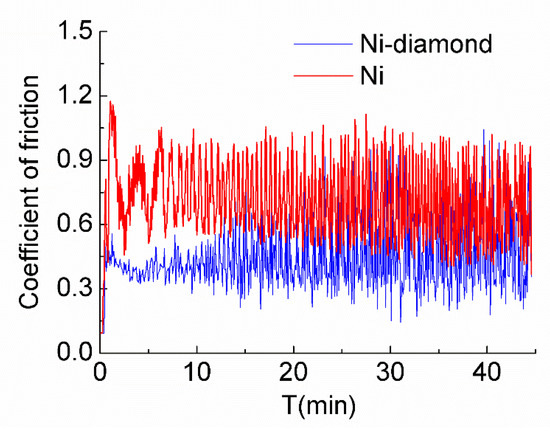 The friction coefficient of the Ni coating and the Ni–diamond coating during wear test.