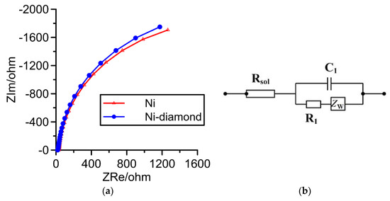 Figure 10 shows the fitting results of the EIS test and the equivalent circuit for the Ni coating and the Ni–diamond coating. Table 2 shows the impedance value of the equivalent circuits. C1 was the double layer capacitance, and Rsol was the solution resistance. R1 was the charge transfer resistance, which could reflect the corrosion resistance. The value of R1 and corrosion rate changed in inverse proportion, and a higher R1 meant better corrosion resistance [22]. The surface impedance of the Ni–diamond coating was slightly increased compared to the Ni coating, which was due to the non-conductivity of the diamond particles. Therefore, the addition of diamond particles has the tendency to increase surface impedance.