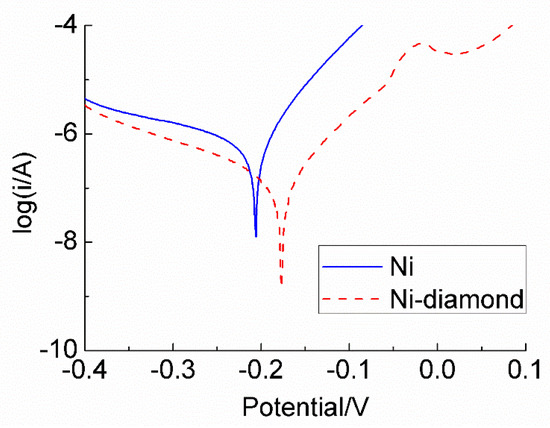 Tafel curve was carried out in a 5 wt.% NaCl solution. Figure 11 shows the Tafel curve of the Ni coating and the Ni–diamond coating; it was found that the Ni–diamond coating had a lower corrosion current and better corrosion resistance. There are two factors that can explain an increase in corrosion resistance. First, the incorporated diamond particles play a major role and act as an inert physical barrier to the initiation and development of the corrosion attack [35]. Second, the closely packed (111) crystallization probably contributed to an increase in the corrosion resistance because dense and close-packed crystallization often shows a higher dissolution resistance due to the total energy required for breaking of the bonds, and the subsequent dissolution of atoms is high [35,36].