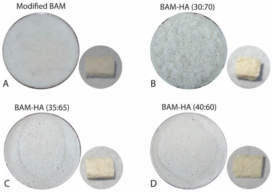 The bio-composite BAM–HAp with different ratios. (A) Modified BAM; (B) 30:70; (C) 35:65; (D) 40:60.