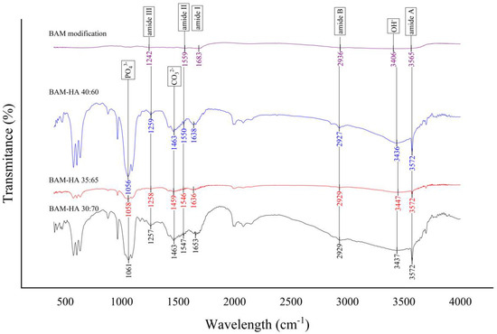 All of the three-sample bio-composite types in FTIR analysis have the absorption of the infrared waves resembling the BAM modification (control). Therefore, the bio-composite has the same functional groups as the control sample, namely the amide I, II, III, A, B and OH. However, the FTIR chart of modified BAM does not show HAp functional groups, PO43− and CO32−, as found in the samples of all bio-composite types. These functional groups do not appear in the modified BAM (Figure 2).