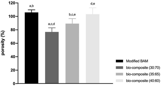 The result of porosity percentage of all types of bio-composite and modified BAM. (a–e means significant difference in each group with the Gomes Howell test with p-value as p < 0.01).