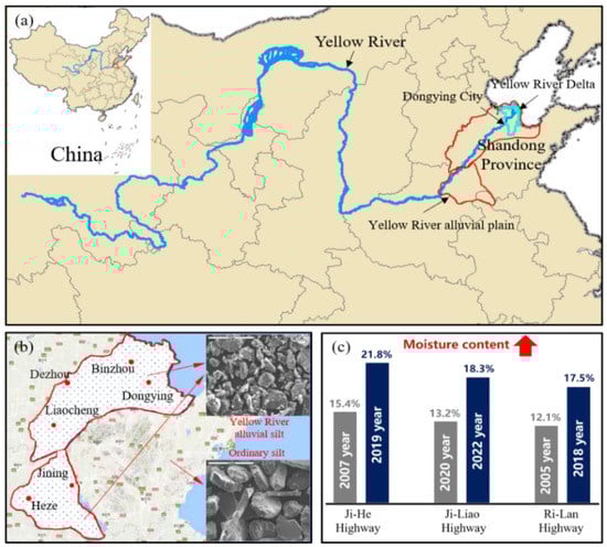 The Yellow River alluvial plain (YRAP) is located in the northwest and southwest of Shandong Province, China [], which covers an area of 63,200 km2 (Figure 1a). This privileged geographical position and abundant natural resources prompted people to settle in this area very early []. A large population and active economy in this area have generated strong demands for transportation facilities, especially highway engineering []. However, the YRAP consists mainly of alluvial silty soils, which are typically employed as backfill for subgrade construction due to the deficiency of coarse-grained soils []. It has the characteristics of high roundness of particle grinding (Figure 1b), low liquid limit, low cohesion and poor water stability. In addition, the groundwater level in this area often tends to be high; a strong capillary effect in alluvial silt brings 85% of in-service subgrades to an over-wet state []. At the same time, the YRAP is situated in a seasonally frozen region [], and the moisture migration in subgrade soil easily leads to water accumulation during freeze–thaw cycles [,]. Under the influence of two above-mentioned conditions, the increase in moisture content (Figure 1c) and the reduction in the stiffness, strength and durability of subgrades directly affects the subgrade stability and threatens traffic safety []. Therefore, cementitious materials such as lime and cement are widely used in the subgrade construction of the YRAP to improve the water stability and durability of the alluvial silt [].