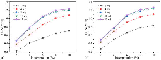 Figure 4 shows the UCS variation curve of the two kinds of improved silt with the increase in curing-agent incorporation and curing age. It can be seen that the UCS of the two kinds of improved silt grows with the increase in incorporation and curing age and then tends to be stable. The incorporation and curing age are conductive to improve the UCS, but more is not always better for saving costs and the construction period. A strength of 7 days and 28 days show a large proportion of final strength; they are of some instructive significance to evaluate the application of improved silt. The reduction in increase rate is more observable when the incorporation is increased up to 6% and 8%. When the incorporation is increased from 6% to 8%, the UCS of ISW-improved silt under different curing ages is enhanced by 12.62%~20.37%, while the UCS of cement-improved silt under different curing ages is enhanced by 12.38%~15.56%. When the incorporation is increased from 8% to 10%, the UCS of ISW-improved silt under different curing ages is improved by 1.69%~7.69%, while the UCS of cement-improved silt under different curing ages is improved by 3.33%~6.73%. The UCS of ISW-improved silt is more susceptible to curing age. At the same time, note that the UCS of cement-improved silt in early stages is generally higher than that of ISW-improved silt with the same incorporation and curing age.