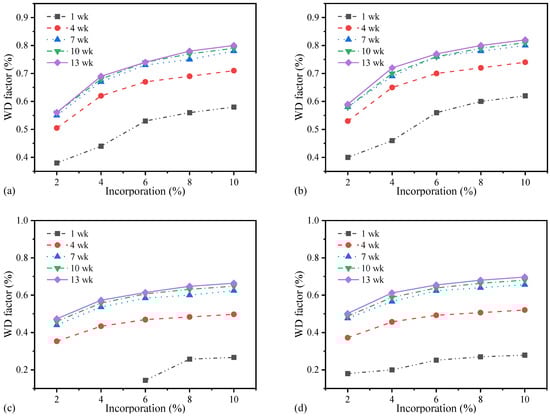 As can be observed from Figure 7, when the incorporation is increased from 2% to 10%, the WD factor of ISW-improved silt under different curing ages and 1 WD cycle is improved by 40.35%~59.46%, while the WD factor of cement-improved silt under different curing ages and 1 WD cycle is improved by 39.66%~61.54%. When the curing age is increased from 1 week to 13 weeks, the WS factor of ISW-improved silt under different incorporation and 1 WD cycle is improved by 35.59%~60.47%, while the WD factor of cement-improved silt under different incorporation is improved by 28.57%~60.00%. It can be inferred that the WD factor improvement of ISW-improved silt under 1 WD cycle is more stable than that of cement-improved silt. ISW-improved silt specimen with curing age of 7 days and little incorporation cannot withstand three WD cycles, while the WD factor of the cement-improved silt specimen can be obtained under same conditions. This indicates that cement helps in enhancing the early strength is more obvious than that of the ISW curing agent. Both of the two kinds of improved silt can meet the requirements of durability. To sum up, ISW-improved silt can present good mechanical and durability with good curing condition and curing age, and is expected to replace the cement-improved silt.
