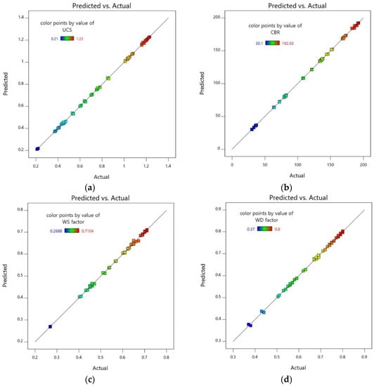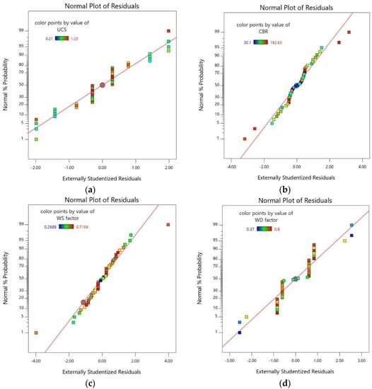 As can be seen from Table 3, the UCS, CBR, WS factor and WD factor model are furnished with a high F value and low p value which is less than 0.05; it indicates that the models are significant. In addition, the positive probability distribution of model residual of each model is depicted in Figure 8. What can be seen is that most test points are evenly distributed in and near the straight line. It indicates that the residuals of UCS, CBR, WS factor and WD factors are independent of the predictive variables, and conform to normal distribution with fewer outliers. It can be considered that incorporation and curing age have good adaptability to the UCS, CBR, WS factor and WD factor model.