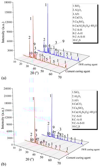 As can be seen in Figure 12b, the diffraction peak of hydration products in the two kinds of improved silts with a curing age of 28 days rises; the active substances react with each other further. The hydration and pozzolanic reaction consume quantities of Al2O3 and C2S, and produce C-A-H, Aft and C-S-H, which is conductive to connect soil particles and enhance the strength of soil are produced [,,]. Note that the C-S-H content in ISW-improved silt is slightly lower than that of cement-improved silt; Aft content is slightly higher than that of cement-improved silt. This is due to dicalcium silicate gradually participating in the reaction with curing age, and the reaction rate of ISW is gradually higher than that of cement. It is also confirmed that the strength enhancement amplitude of ISW-improved silt between curing age of 7 days to 28 days is larger than that of cement-improved silt; the difference of hydration products between the two is caused by the difference of their composition.