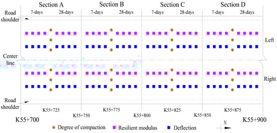 It is of practical guiding significance to examine the in-service performance of improved soil in specific applications. In this study, the in-situ test site (K55 + 700~K55 + 900) was chosen from the Heze section of the Ri-Lan Expressway, which is the same site as the specimens sampling site of the laboratory tests. The whole test section is divided into four 50 m test sections (section A, section B, section C and section D, as shown in Figure 13). The degree of compaction, resilient modulus and deflection were tested at specific points (i.e., different curing ages, different locations, different incorporation of ISW curing agent and cement, as shown in Table 5), respectively. It is worth noting that the results of 48 sets of degree of compaction filed tests all met the construction quality requirements. Therefore, the field data is scientific and reliable in this study.