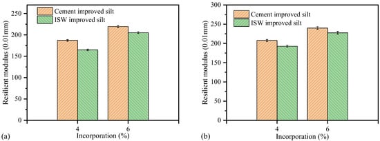 The comparison of the resilient modulus of the two kinds of improved silt is shown in Figure 14. It can be observed that the resilient modulus grows with the increase in incorporation and curing age. With the same curing age, when the incorporation increases from 4% to 6%, the resilient modulus enhancement amplitude of ISW-improved silt is 18.10%~24.42%, which is larger than that of cement-improved silt (15.64%~17.28%). With the same incorporation, when the curing age increases from 7 days to 28 days, the resilient modulus enhancement amplitude of ISW-improved silt is 10.93%~16.86%, which is also larger than that of cement-improved silt (9.36%~10.92%). Though the resilient modulus of ISW-improved silt is slightly less than that of cement-improved silt under the same curing age and incorporation, the resilient modulus enhancement amplitude of ISW-improved silt is lager.