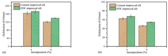 The comparison of the deflection of two kinds of improved silt is shown in Figure 15. It can be seen that the deflection declines with the increase in incorporation and curing age, which indicates the quality of subgrade has been effectively promoted. With the same curing age, when the incorporation increases from 4% to 6%, the deflection reduction amplitude of ISW-improved silt is 19.15%~19.22%, which is less than that of cement-improved silt (26.21%~26.37%). With the same incorporation, when the curing age increases from 7 days to 28 days, the deflection reduction amplitude of ISW-improved silt is 61.00%~61.04%, which is less than that of cement-improved silt (61.84%~61.92%). There is no doubt that the influence of curing age on deflection is more sensitive than incorporation; improved silt with a curing age of 28 days displays greater deformation-resistance behaviors compared to that with a curing age of 7 days. The in-service performance of ISW-improved silt shows little difference to that of cement-improved silt; both of them meet the requirements from the aspect of in-situ application.