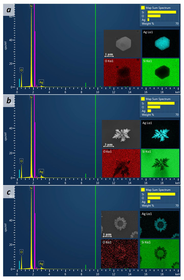 EDX-spectra, SEM and EDX maps of SiO2(Ag)/Si with Ag crystal (a), dendrite (b), and “sunflower-like” (c) structures.