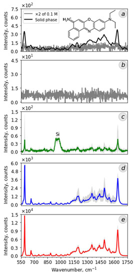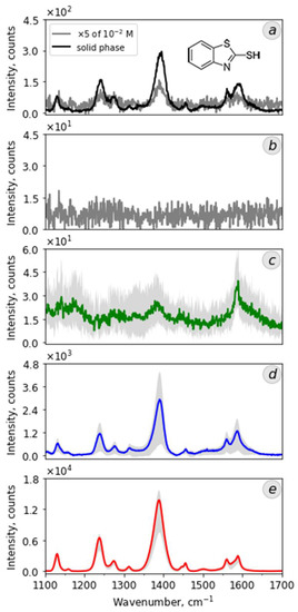 Crystallites, dendrites, and “sunflower-like” structures were evaluated for their use as plasmonic-active surfaces enhancing the Raman signal. Nile Blue dye (NB, C20H20ClN3O) and 2-mercaptobenzothiazole (MBT, C7H5NS2) were used as the test analytes in the experiment. Figure 5 and Figure 6 show the Raman spectra obtained from the solid phase of substances as well as solutions (water solution for NB and ethanol solution for MBT) with the minimum concentration of analytes at which it is possible to distinguish their main characteristic peaks. For NB, these peaks are in the area of 590 cm−1 (phenoxazine ring mode [59]) and 1600 cm−1 (aromatic benzene ring breathing and stretching vibrations [60]). For MBT, they are in the area of 1380 cm−1, which is combined with stretching of the NCS-ring, and peak 1240 cm−1 relates to the C–S stretching modes [61], and in the area of 1589 cm−1, which corresponds to C=C stretching [62]. Figure 5b and Figure 6b have the spectra of the analytes with a concentration 10−6 M, which was also used for the next SERS investigations. It should be noted there are no molecular “fingerprints” there, only the background. Figure 5c–e for NB and Figure 6c–e for MBT show the mean SERS results of five spectra taken from different silver structures of the same type. The intensity values of the mean spectra for the lines under consideration are given in Table 2. The variation of intensity values is indicated in gray color in the graphs.