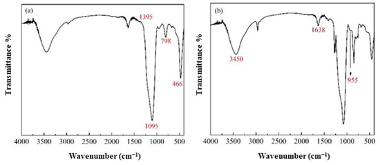 FT-IR analysis was further carried out to verify the conversion of SiO2 aerogel in the surface-modified process. As shown in Figure 2 of the unmodified SiO2 aerogel, the peak at 1095 cm–1 could be ascribed to the anti-symmetric stretching vibration of Si–O–Si, while peaks at 798 and 466 cm−1 could be assigned to the symmetrical telescopic vibration and bending vibration of Si–O. The small absorption peaks of 1395 and 747–791 cm−1 were the shear bending vibration and plane bending vibration of –CH3, respectively, indicating that there were hydrophobic groups on the terminal branch of the aerogel [22]. After the modification with non-ionic surfactant and anionic dispersant, several peaks appeared in the spectrum compared with that of the unmodified SiO2 aerogel. For example, peaks at 3450 and 1638 cm−1 could be ascribed to the anti-symmetric stretching vibration and bending vibration of –OH, while the peak at 955 cm−1 could be assigned to the bending vibration of Si–OH. The peak at 2900 cm−1 could be addressed to the stretching vibration peak of C–H, which belongs to the same peak groups containing shear bending vibration peak and plane bending vibration peak of –CH3 at 1395 cm−1 and 747–791 cm−1, respectively. The peak of 1250 cm−1 was attributed to the C–N bond that came from 3-aminopropyl silanetriol of hydrolyzed KH550 [23]. All of these bands’ intensities were enhanced, suggesting that hydrophilic groups were grafting onto the aerogel surface to improve its dispersivity in an aqueous system.