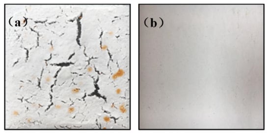 Figure 5 shows that the length of fibers had a great influence on the preparation and property of the coating. When ceramic fibers with excessively short lengths were added, obvious cracks were observed in the coating, which meant that the cracking resistance of the coating was adversely affected. While if the fibers were too long, the workability of the coatings would be adversely affected. When fibers with different lengths were added, as shown in Figure 5b, the adverse effects on the surface cracking resistance and workability were eliminated, the prepared coating showed a relatively even surface without cracking.