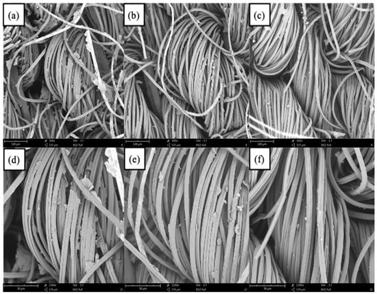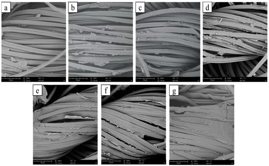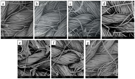 SEM images corresponding to the microstructure of fabrics are shown in Figure 1 and Figure 2. Figure 1a–g shows the samples that were dipped 1–7 times at 1500× g, respectively, and Figure 2a–g shows the samples that were dipped 1–7 times at 500× g. Figure 1a and Figure 2a are used as the control in the morphologies analysis due to the different dipping times. As shown in Figure 1, a thin monolayer with irregular edges is observed, and rGO is successfully adhered to the surface of the fabric after dipping. As the dipping times increase from 1–4, a discontinuous and sparse layer containing rGO on the surface of fabrics increases successively. However, the graphene lamellar completely covers the surface of the fibers, and the continuous block and irregular edge on the smooth surface of fibers appear after the fifth impregnation. When the impregnation times continue to increase, the surface of the fabric gradually appears the stacking of reduced graphene oxide, which may have a certain impact on the conductive effect of the fabric. It can be preliminarily judged that five times impregnation can meet the basic requirements of preparing graphene conductive fabrics.