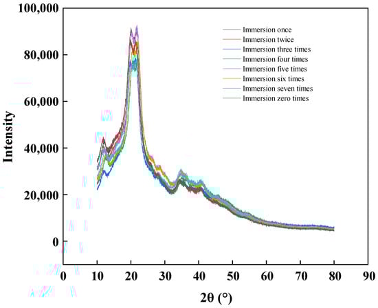 XRD analysis results of the prepared materials are presented in Figure 3. A low and sharp diffraction peak at about 11° indicates that GO is attached to the fabric. Meanwhile, there is a high-intensity diffraction peak at about 22°, demonstrating that most of the GO-coated on the fabrics has been reduced to rGO. As impregnation times increase, the graphene diffraction peaks shift to the left. The diffraction peak around 42° can be due to the stacking of GO, then leading to the formation of a small amount of graphite after reduction [18,42,43]. The above XRD characteristic peaks fully illustrate the successful preparation of conductive fabrics, i.e., the graphene oxides have been successfully coated on the fabrics and then are partly reduced.