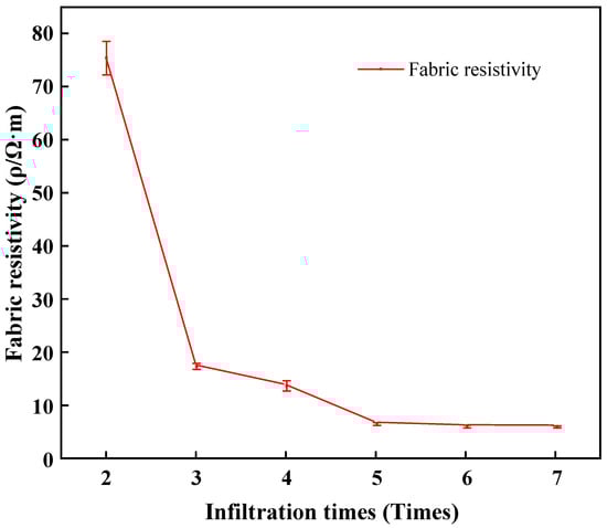 Four probe tester is used to measure the resistivity of the fabric with different impregnation times, and the corresponding results are shown in Figure 4. For the first impregnation, the resistivity of treated fabric is high and over the range of the four-probe tester because of the attachment of little amount of GO on fabrics. The adsorbed graphene is not enough to form a good conductive layer with a large area. So, the fabrics are almost not conductive, and the fabric resistivity is large. As the increase of impregnation times from 2 to 5, the resistivity of the fabrics decreases and becomes stable. After the fifth repetition, the resistivity of the fabrics is around 6.8 Ω·m and then changes little. The impregnation and drying process is repeated, but the resistivity of the fabrics does not decrease significantly. With the increase of impregnation times, the amount of graphene oxide adsorbed on the fabric gradually increases. After reduction, the obtained rGO conductive layer is good, so the resistivity of the conductive fabric shows a downward trend. When the impregnation times reached five, it can be seen from Figure 1 that some graphene precipitates appear on the surface of the fabric, indicating that the adsorbed graphene on the fabric has reached saturation. Therefore, the resistivity of the fabrics does not decrease significantly with the increase in impregnation times. The precipitation and stacking of graphene can affect the electrical conductivity of the fabrics. In conclusion, the best number of impregnation times for preparing graphene conductive fabrics is five.