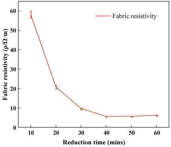 Before the reduction of prepared materials, the samples that impregnation five times are carried out. After different reduction times in ascorbic acid, the resistivities of the prepared fabrics are measured using the four-probe tester to investigate the relationship between the reduction time and the resistivity of the fabrics, and the results are shown in Figure 5. It is seen that the resistivity of the fabrics decreases gradually as the increase of reduction time. After 40 min, the resistivity of the fabric is around 5.6 Ω·m. So, the reduction time over 40 min has little effect on the resistivity of the fabrics. The resistivity at reduction times of 50 and 60 min is slightly higher than that at 40 min. When the reduction time is short, graphene oxide adsorbed on the fabrics cannot be completely reduced, so the conductive layer is incomplete, leading to a large fabric resistivity. With the increase in reduction time, the adsorbed film of graphene oxides is good when the reduction time is over 40 min. Therefore, the resistivity of the conductive fabrics is lowest after 40 min. When the reduction time continues to increase, the formed rGO conductive layer can be partially damaged at a high temperature, resulting in a slight increase in fabric resistivity. In conclusion, the best time for reducing GO is 40 min.