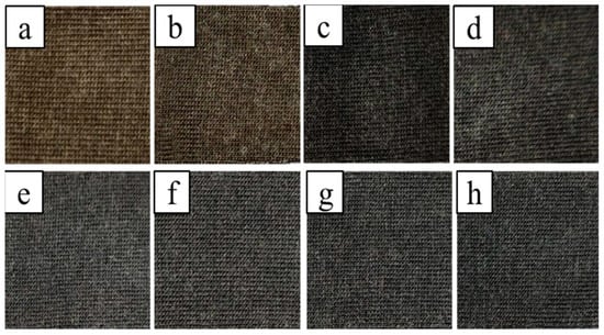 After impregnation five times, the fabric is immersed in 0.06 mol/L ascorbic acid for 40 min, and the reduction temperature is changed from 45 to 95 °C. The images of different samples are shown in Figure 7. The resistivity of samples at 45, 55, 65, 70, 75, and 80 °C cannot be measured. This is because a low temperature causes a slow reaction rate, so a continuous conductive film on the fabrics has not yet formed, leading to a large resistivity. As seen in Figure 7, the color of the prepared fabric gradually changes with the increase of temperature from gray-brown to black-grey, and the reduction degree of samples increases gradually from 45~90 °C.