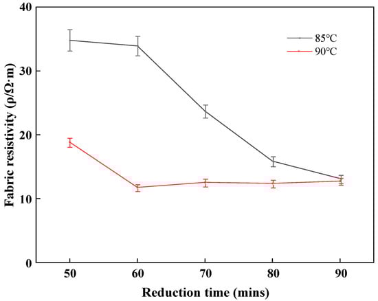 The relationship between the resistivity and reduction time is shown in Figure 8. When the reduction temperature is 90 °C, the GO on fabrics can be completely reduced in 60 min. As the increase of reduction time, the resistivity of the fabric changes little with a value of 11 Ω·m. This is because the extension of reaction time makes more oxygen-containing functional groups combine with the oxidation product of ascorbic acid, gulonic acid, rather than be reduced. Meanwhile, when the reduction temperature is 85 °C, the reduction of GO has not been complete in 90 min, and the fabric resistivity is slightly higher than that at 90 °C. As shown in Figure 6 and Figure 8, although the fabric can be completely reduced at 90 °C by prolonging the reduction time, the resistivity at 90 °C is less than that at 95 °C. Therefore, the optimal reduction temperature is 95 °C.
