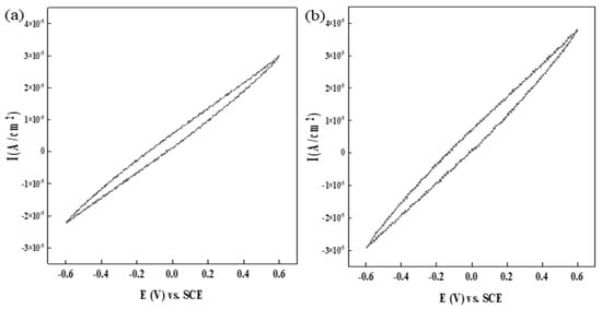 The scanning speeds of CV tests are 50 and 100 mV/s, respectively [46]. The CV curves of the prepared samples are shown in Figure 9. CV curve shows a regular symmetrical shape, which indicates that the prepared material has good cyclic properties during the charging-discharging processes. The reaction on the GO conductive fabric is reversible, and the conductive fabric has the potential to be a capacitor [47]. It can be seen from the specific capacitance calculation formula that the specific capacitance is proportional to the area surrounded by the CV curve. The CV curve of this sample is a waist circle with a small area. Therefore, the prepared sample capacitance is not sufficient as a supercapacitor, and it still needs further improvement.