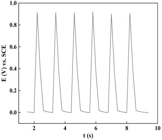 Graphene conductive fabric is also investigated by a constant current charge-discharge test, and the result is shown in Figure 10. The prepared rGO fabrics are charged and discharged at a current of 10 μA. The discharge starts at the voltage of 0.8 V vs. SCE, while the charge starts at 0 V vs. SCE. The charging-discharging process can be repeated. During this process, the electrochemical performance almost does not decay, and the redox reaction on the graphene fabric is completely reversible. The charge-discharge voltage changes with time in a symmetrical triangular distribution, but its charge-discharge curve is not perfectly linear, only quasi-linear. These are mainly because graphene contains some oxygen-containing functional groups, which can provide a certain amount of pseudocapacitor, furtherly confirming the results of CV curves [48,49].