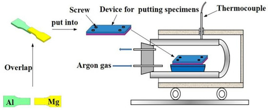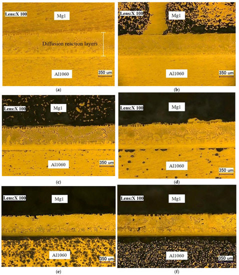 With the continuous and rapid development of modern industrial technology, the sustainable development of lightweight materials for environmental protection and energy savings has attracted more and more attention in today’s society [1]. Magnesium and aluminum are two lightweight nonferrous metals of low density and high specific strength compared to common structural materials such as steel. Their alloys have been widely used in global transportation, especially in the automotive and aerospace industries [2,3,4]. At present, rolling, bonding, and welding are commonly used processes by which it is possible to achieve an effective combination of Mg and Al heterogeneous metals. These processes not only result in an optimization of the structural qualities but also take full advantage of the respective metals’ properties [5,6]. The welding methods that are used at present in realizing the combination of Mg/Al heterogeneous metals mainly include laser welding [7], TIG welding [8], stir friction welding [9,10], diffusion welding [11,12], and ultrasonic welding [13]. The chemical reactivities of magnesium and aluminum are relatively high, and defects such as oxidation, cracks, and pores can easily appear in the process of traditional fusion welding. Vacuum diffusion welding is a solid-state welding method that uses a low heat input during the welding process. As a result, the metal base material does not melt; it only undergoes a microscopic plastic deformation at the surface. The quality of the welded joint is, therefore, relatively stable. This method is suitable for welding metal materials with different physical properties, such as the coefficient of thermal expansion. It is, thus, applicable to magnesium and aluminum.