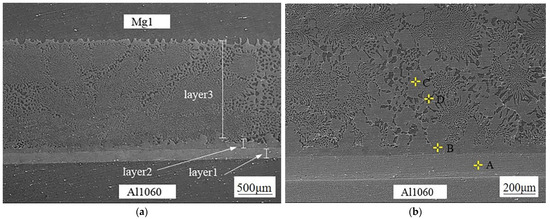 SEM images of the Mg1/Al1060 diffusion layers: (a) SEM image at low magnification, (b) SEM image at high magnification.