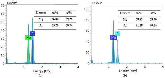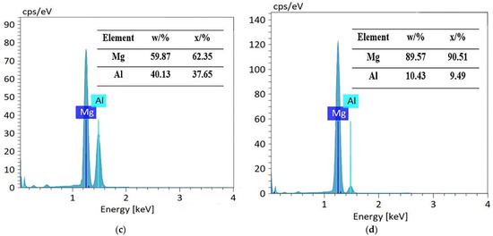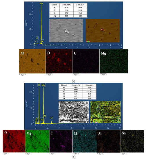 Figure 9c,d shows the EDS determination results of the Mg2Al3 layer and Mg17Al12 layers, respectively; it can be observed that aluminum and magnesium play a dominant role in their surface composition, oxygen is not widely and evenly distributed on their surface, and oxygen was dominating in the vicinity of the corrosion defects (including pits and cracks) as well as in block- and needle-like corrosion products. However, in the surface composition of the tested Mg17Al12 and Mg-based solid solution layer, magnesium, aluminum, and oxygen predominate (see Figure 9f), and oxygen content reaches 26 wt.%, reflecting the existence of many corrosion products on its surface. Moreover, the elemental composition of the corrosion products of these three diffusion layers was mainly magnesium, aluminum, and oxygen (see Table 5). In conclusion, each diffusion layer’s corrosion products were not only single component products. There was probably an occurrence of various oxides and hydroxides of Mg and Al, irregularly attached to the surface.