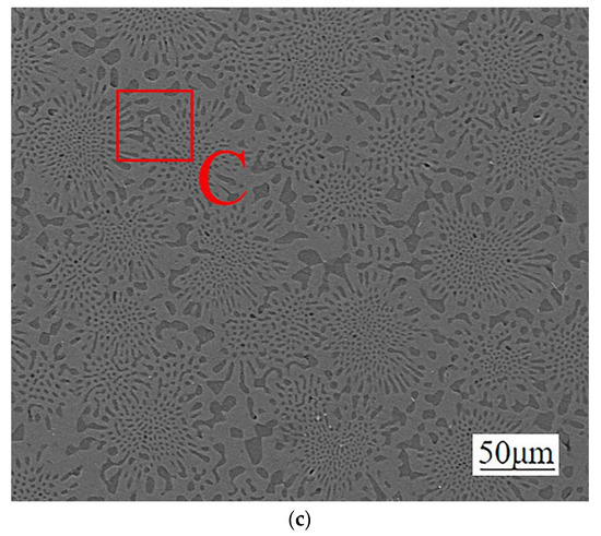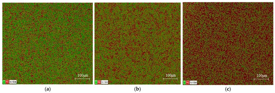 Figure 5 shows the cross-sectional structure of each diffusion layer (Mg2Al3 layer, Mg17Al12 layer, and Mg17Al12 and Mg-based solid solution layer) after grinding. It can be seen that the structure and morphology of each diffusion layer are intact, and the surface is free from defects. In order to verify the composition of each diffusion layer, its composition was examined by using EDS. Figure 6 shows the elemental detection results of the EDS surface scan, where red represents the Mg element and green represents the Al element. It can be seen that the Mg and Al elements were uniformly distributed in these samples, which reflects the presence of only one single and homogeneous phase in each of these diffusion layers. The Al element, as represented by green in the Mg2Al3 diffusion layer, is dominating in the samples. In comparison, the presence of the Mg element, as represented by red, has significantly increased in the Mg17Al12 diffusion layer. While the most apparent Mg element can be observed in Mg17Al12 and Mg-based solid solution diffusion reaction layer. These experimental findings are consistent with the theoretical composition of phases in each diffusion layer. The chemical composition of position A in the Mg2Al3 layer, position B in the Mg17Al12 layer, and position C in the Mg17Al12 and Mg-based solid solution layer has been analyzed by performing an EDS area scan. The results are presented in Table 3, where it can be seen that the content of aluminum has gradually decreased, while the content of magnesium has gradually increased when going from box A to box C. This result further verifies the phase composition of the extracted diffusion layers in combination with the Mg/Al alloy phase diagram.