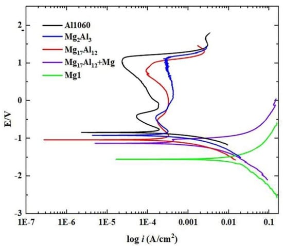 After the immersion in a 3.5 wt.% NaCl solution, Figure 7 shows the polarization curves for the Mg1 and Al1060 substrates. It also shows the polarization curves for the Mg2Al3, Mg17Al12, Mg17Al12, and Mg-based solid solution layers. It is clear that the cathodic reaction is most prominent for the Mg1 substrate, while Al1060, Mg2Al3, and Mg17Al12 show a passive and similar electrochemical behavior over a wide potential range. This result suggests that the corrosion resistance of Al1060 and each of the diffusion layers are better than the corrosion resistance of Mg1. Based on the polarization curves, polarization data (including corrosion potential (Ecorr), corrosion current density (Icorr), polarization resistance (Rp), and corrosion rate (Vcor)) have been calculated and are listed in Table 4.