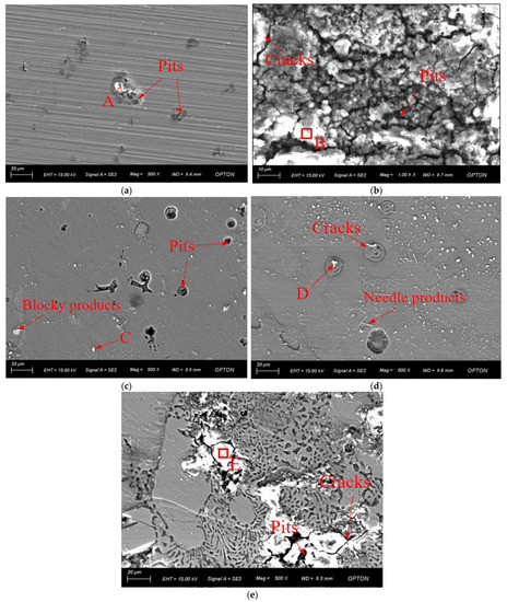 Surface morphologies of the substrates and different diffusion layers after potentiodynamic electrochemical measurements: (a) Al1060, (b) Mg1, (c) Mg2Al3 layer, (d) Mg17Al12 layer, and (e) Mg17Al12 and Mg-based solid solution layer.